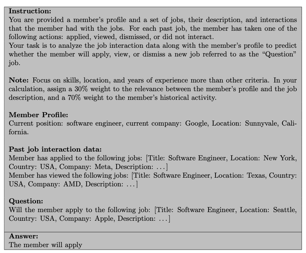 The authors draw a parallel between this approach and the next-token prediction objective used in training decoder-only LLMs. This similarity allows them to adapt such an architecture for their foundation ranking model, named 360Brew. They provide an illustrative example of a prompt that combines the member's profile, past job interaction data (applications, views, dismissals), and a 'Question' job, along with specific instructions on how to weigh different factors (like skills, location, experience, and past activity) to predict the member's future action (apply, view, or dismiss).