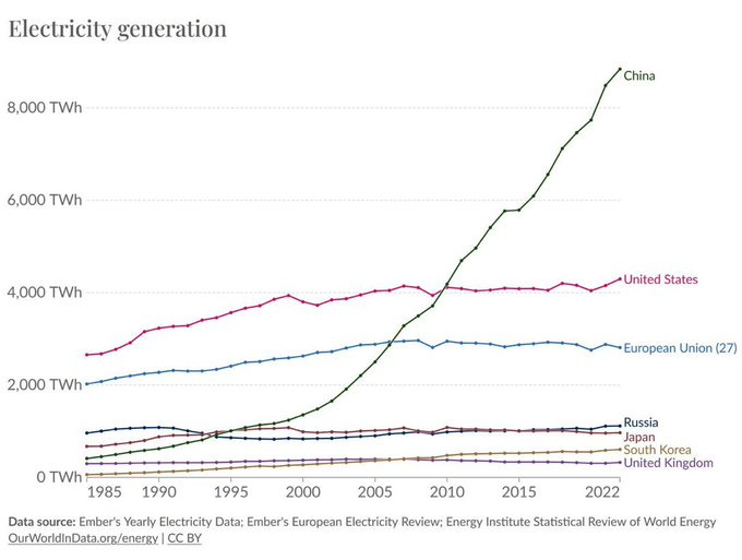 The US has been struggling to add new electricity generation capacity. In the last 25 years, the capacity in the US has been flat whereas China as grown 6X (chart below). This disparity in growth raises questions about the US's ability to meet future energy demands, especially for supporting and maintaining the lead in AI